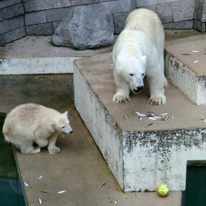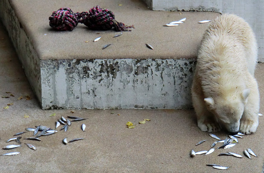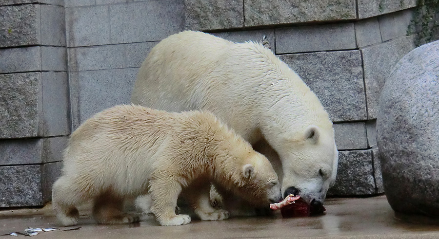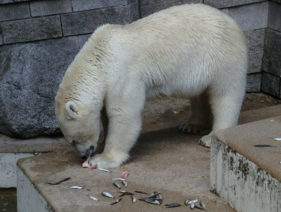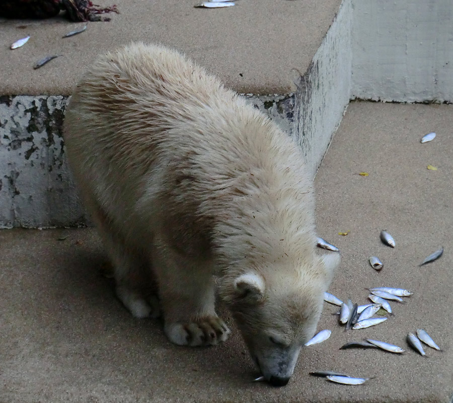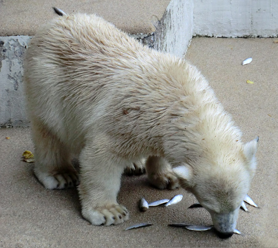 Zum Frühstück konnten die Eisbärin VILMA und das Eisbärjungtier ANORI am ersten Samstag im August 2012 im Zoologischen Garten der Stadt Wuppertal reichlich Fisch schlemmen.