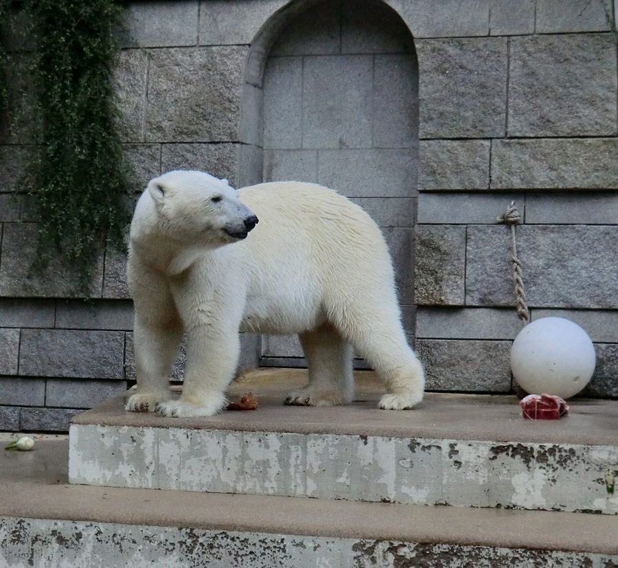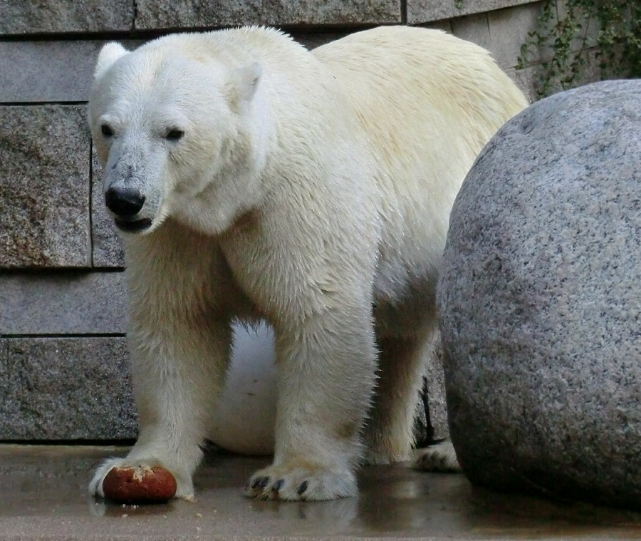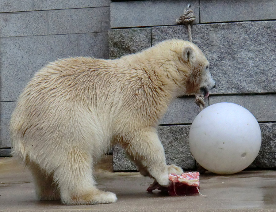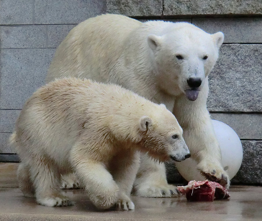 Zusätzlich gab es für die beiden Eisbären Fleisch, Brot und zwei Honigmelonen. Nach dem gemeinsamen Fressen von Fisch, Fleisch und Brot mit der Mutter spielte Eisbärchen ANORI zunächst mit den Melonen. Dabei warf ANORI die Melonen ins Wasser, tauchte mit ihnen und holte sie wieder an Land.