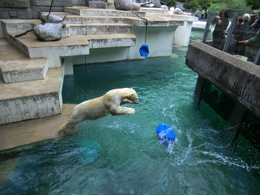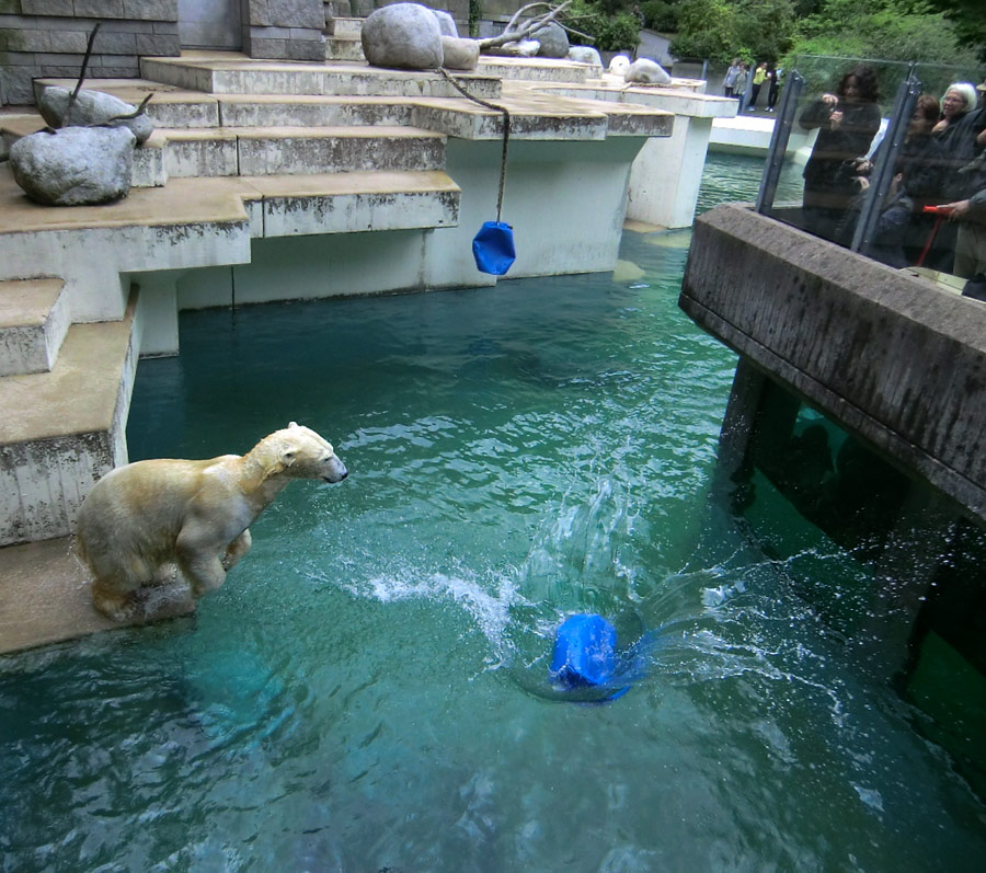 Gegen Mittag warf eine Tierpflegerin ein gelbes Spiel-Ei ins Wasser der großen Außenanlage für Eisbären.