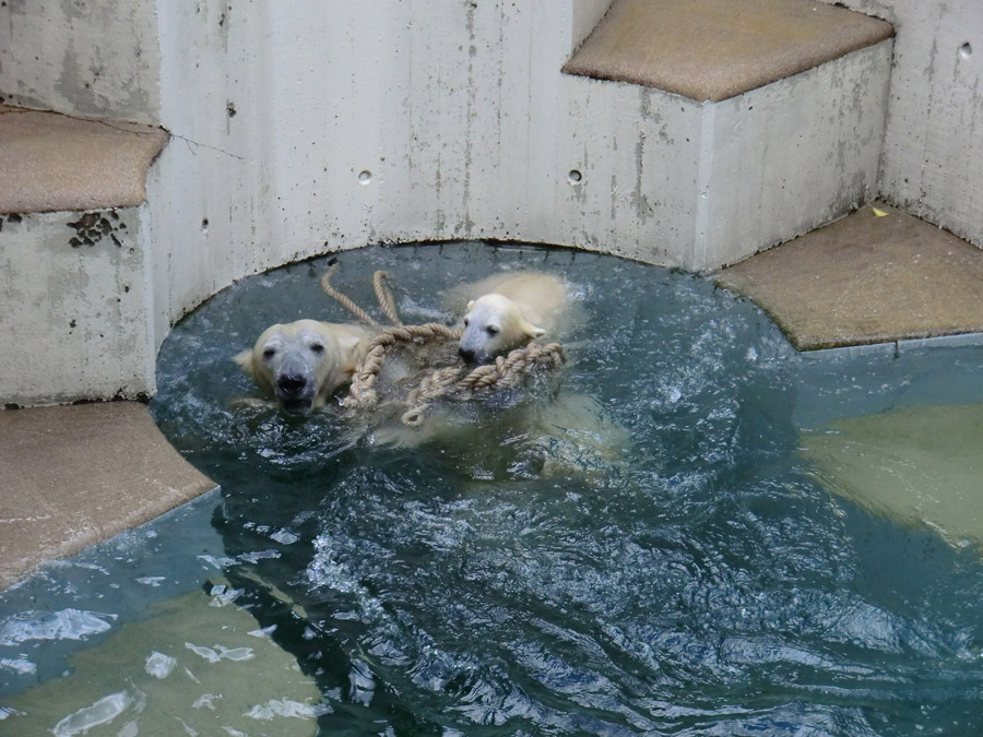 Das Spielzeug wird nach einigen Tagen gegen anderes Beschäftigungsmaterial ausgetauscht. Eisbärmädchen ANORI kennt bereits das meiste Spielzeug. Auf der großen Anlage ist der Bewegungsspielraum im Vergleich zur kleinen Mutter-Kind-Anlage deutlich ausgeweitet, so dass sich für die beiden Eisbären auch neue Spielmöglichkeiten ergeben.