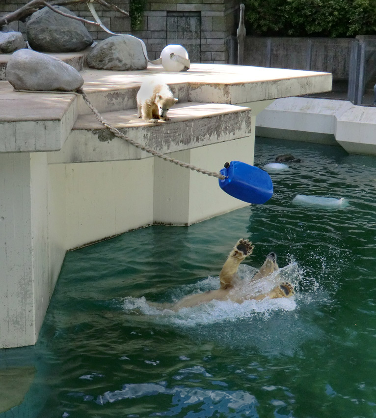 Am 9. Juni 2012 fanden Eisbärin VILMA und Eisbärmädchen ANORI auf der großen Freianlage im Wuppertaler Zoo ein zweites blaues Fass, das mit einem Seil an einem der ausgelegten Steine befestigt war.