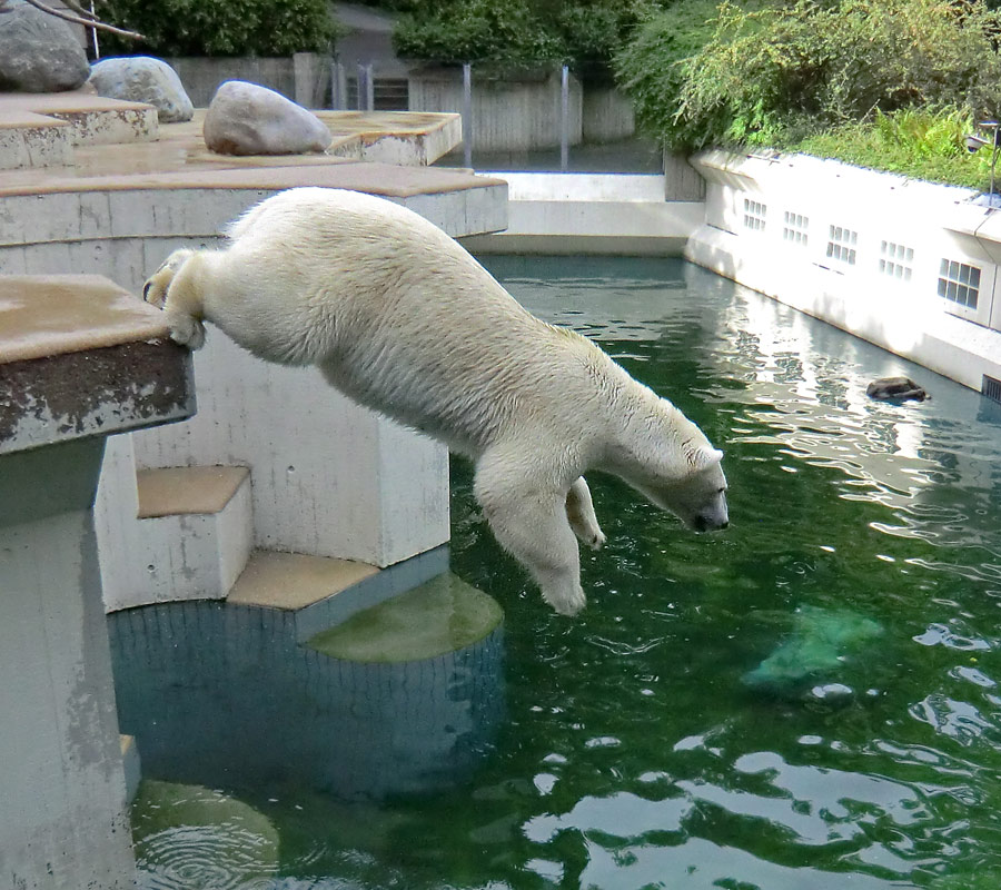Eisbärmutter VILMA springt auch gern ins Wasser und recht häufig von der Plattform. Die Zoobesucher/innen freuen sich schon auf gemeinsame Sprünge der beiden Eisbären von der Plattform ins Wasser: "Das wird spritzen".