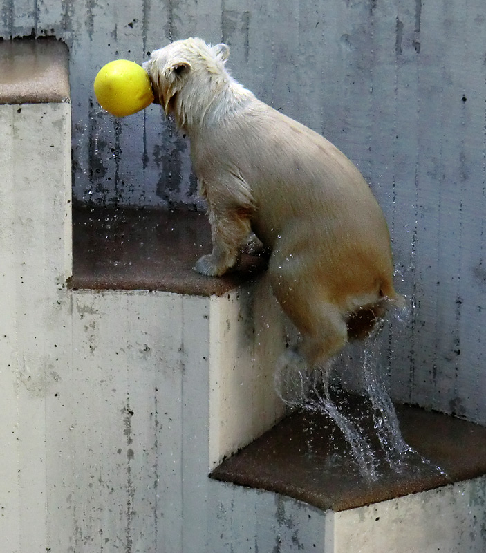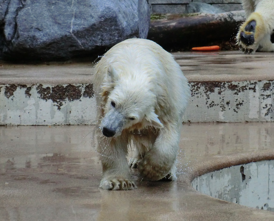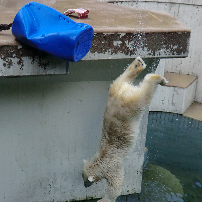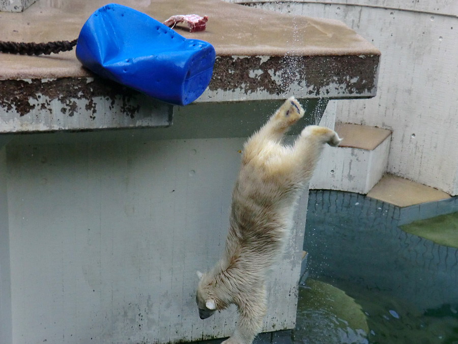Einige Zoogäste waren sich nicht sicher, ob dieser Sprung von der Plattform der großen Außenanlage von ANORI beabsichtigt war. Eisbärjungtier ANORI hatte das blaue Fass am Seil auf die Plattform gehievt und spielte mit dem blauen Fass. Beim Vorwärtsschieben des Fasses bis zur Kante der Plattform verlor ANORI das Gleichgewicht, rutschte am Fass ab und sprang von oben ins Wasser.
