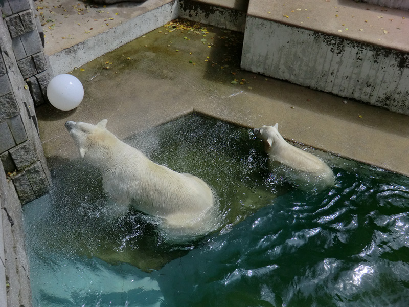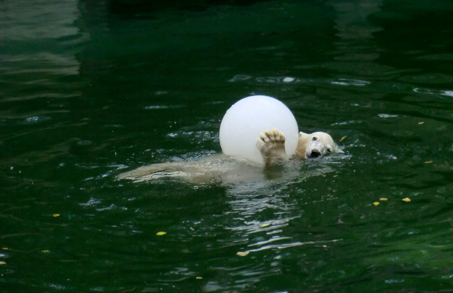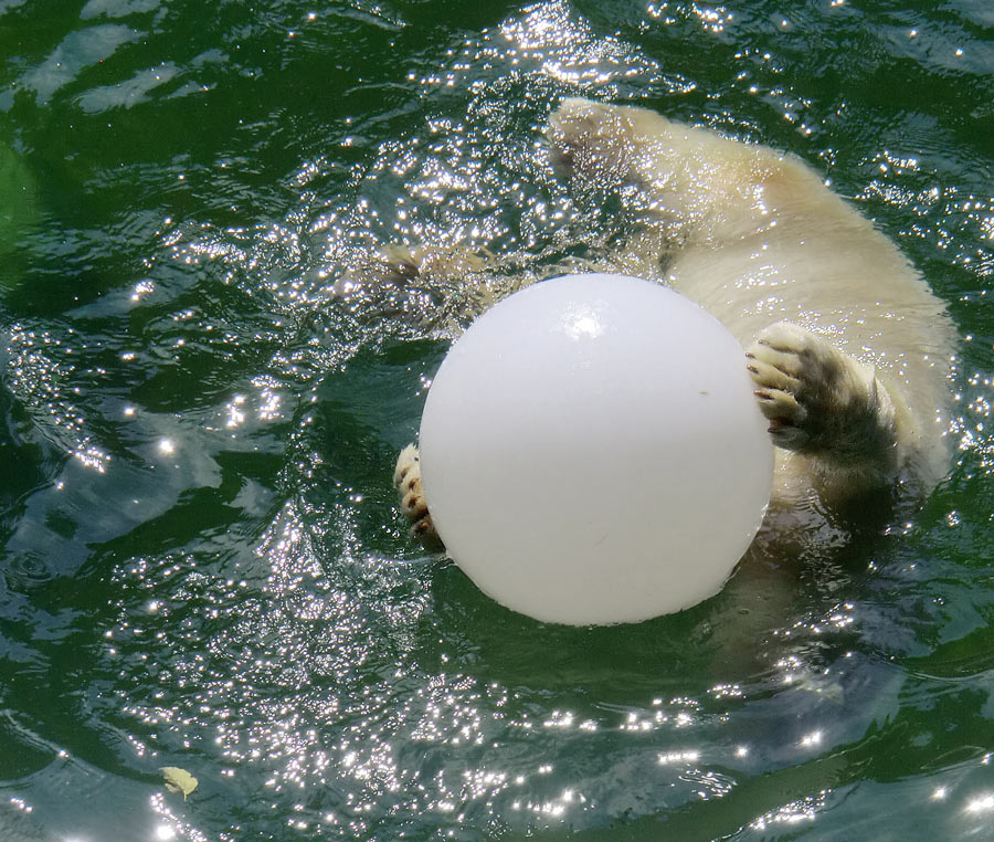 Am Sonntag Nachmittag bekamen die beiden Eisbären im Zoologischen Garten der Stadt Wuppertal zusätzlich einen weißen Ball zum Spielen. Solche Spezialbälle bestehen aus hartem Kunststoff, der den Belastungen durch die Eisbären standhalten kann.