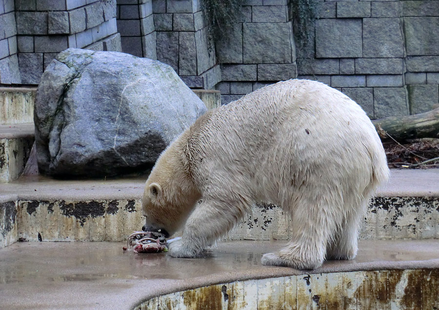 Am Mittwoch Nachmittag kamen die Tierpfleger mit zwei sogenannten Eisbomben zur großen Freianlage für Eisbären. In den Eimern mit gefrorenem Wasser befanden sich gefrorene Fische, weiße Ratten, Äpfel und Nüsse.