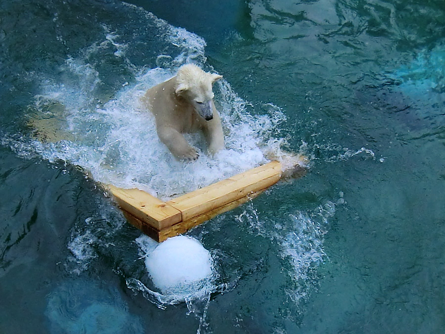 Mit großer Spielfreude sprang das Eisbärchen auf das eigens für die Eisbären gebaute Floß.