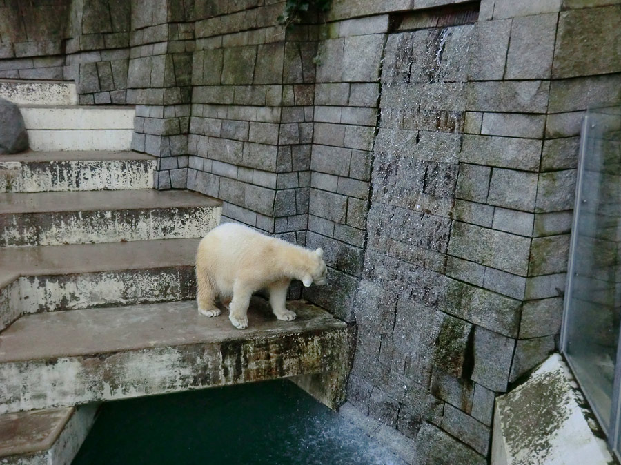 Zurück auf der großen Anlage setzte das Eisbärmädchen ANORI seine Erkundungstour fort und kletterte wieder auf die die Steine und untersuchte eingehend die Mauern des Eisbärengeheges.
