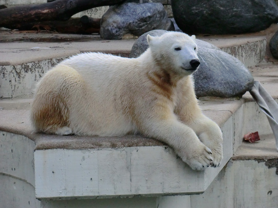 Am Sonntag Morgen stand bei Eisbärmädchen ANORI Relaxen auf dem Programm. Ausgiebig döste Eisbärjungtier ANORI auf der Plattform auf der großen Freianlage für Eisbären im Zoologischen Garten der Stadt Wuppertal.