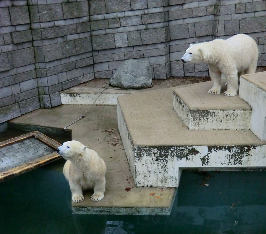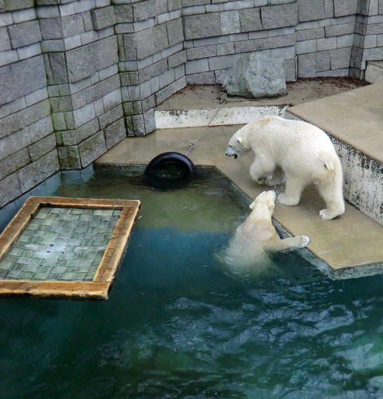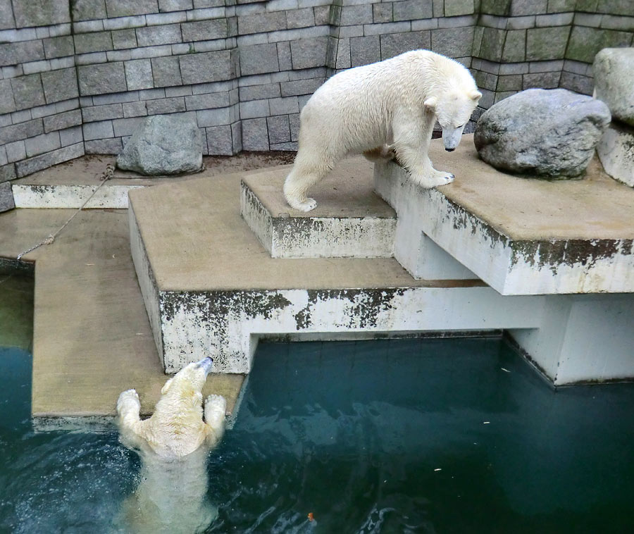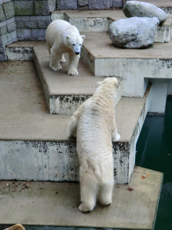 Eisbärin ANORI am Wasser und Eisbär LUKA auf der Treppe im Wuppertaler Zoo am 26. Dezember 2013.