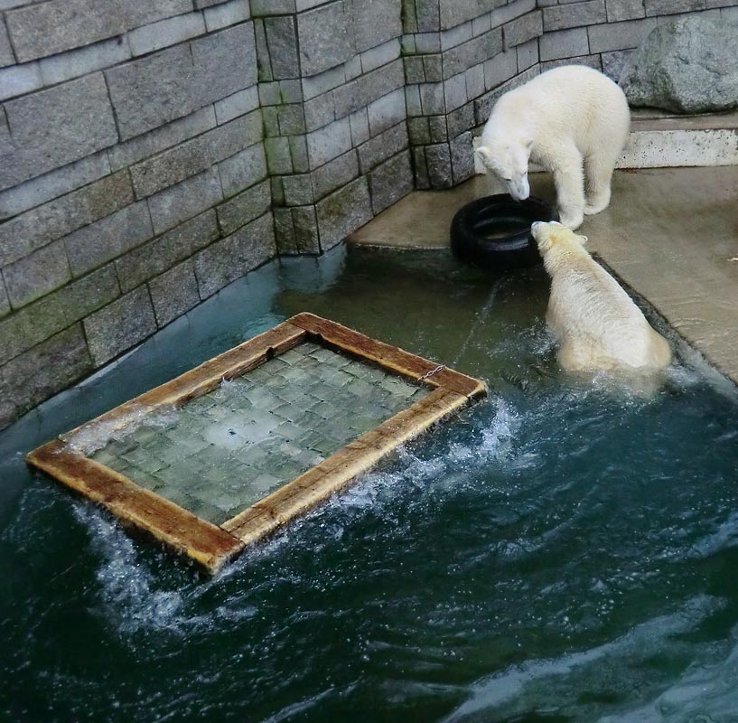 Am 24. Dezember 2013 bekamen Eisbär LUKA und Eisbärin ANORI gegen Mittag auf der Mutter-Kind-Anlage jeweils ein Stück Fleisch. Das Tierpflegeteam hatte Tannenzweige auf die kleine Anlage gelegt.