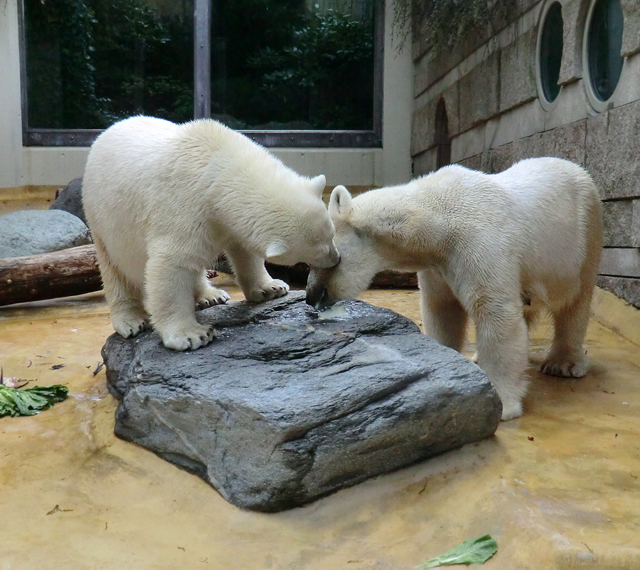 Am Montag, dem 13. Mai 2013, konnten Zoobesucher/innen die beiden Eisbärinnen in trauter Zweisamkeit beobachten. Zum Abendessen hatte das Tierpflegerteam auf der kleinen Eisbärenanlage auf einem Stein an mehreren Stellen auch Leckereien platziert. Genüsslich schleckten Eisbärjungtier ANORI und Eisbärin VILMA die Creme vom Stein.