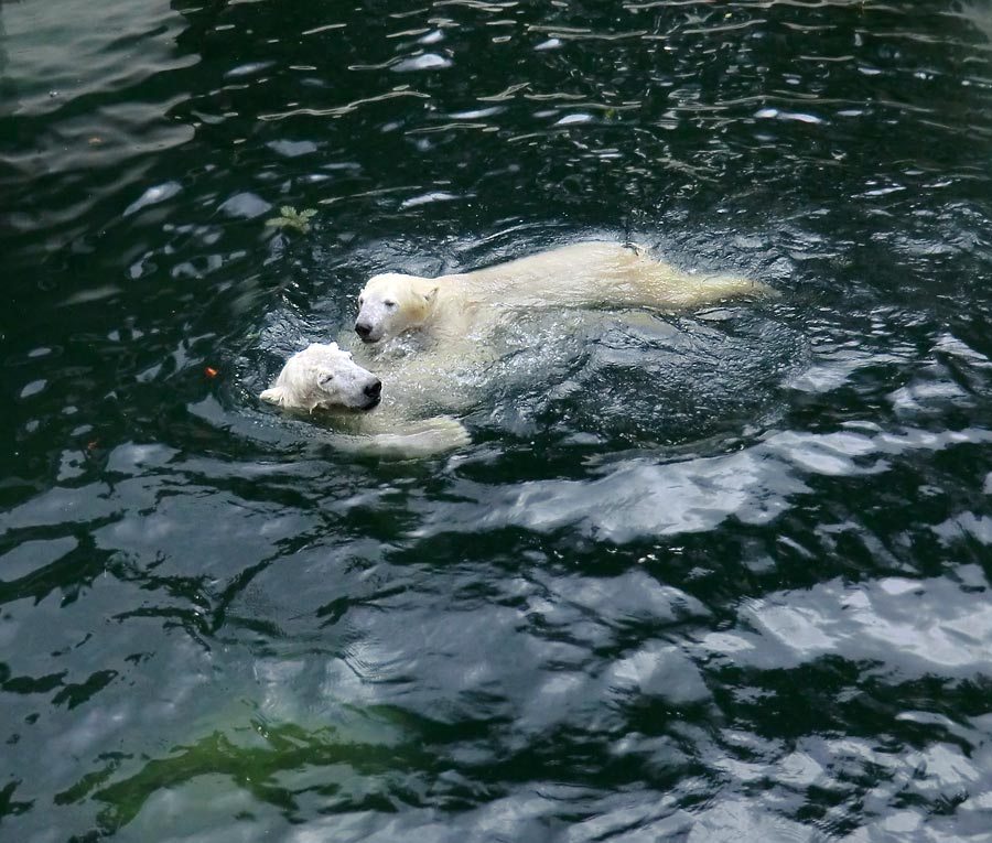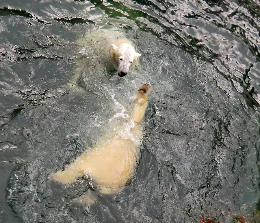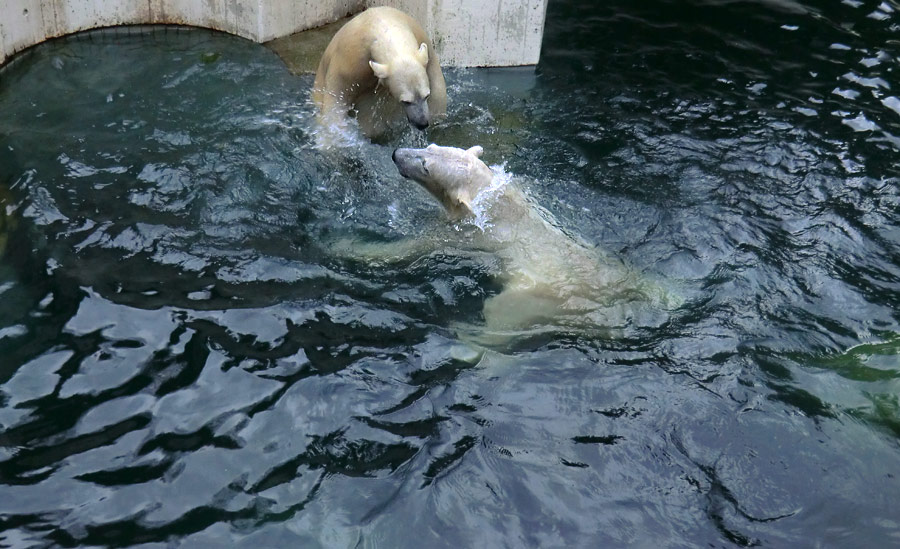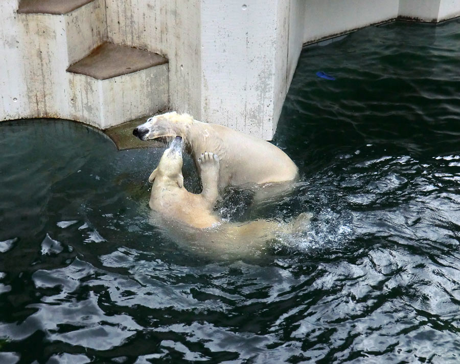Eisbärin ANORI und Eisbär LUKA spielten im Wasser der großen Freianlage für Eisbären im Wuppertaler Zoo. Die friedliche Rauferei begann an den Unterwasserscheiben und endete an der Treppe am kleinen Wasserfall.