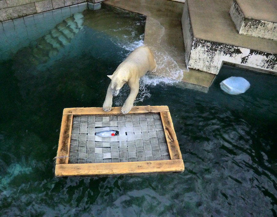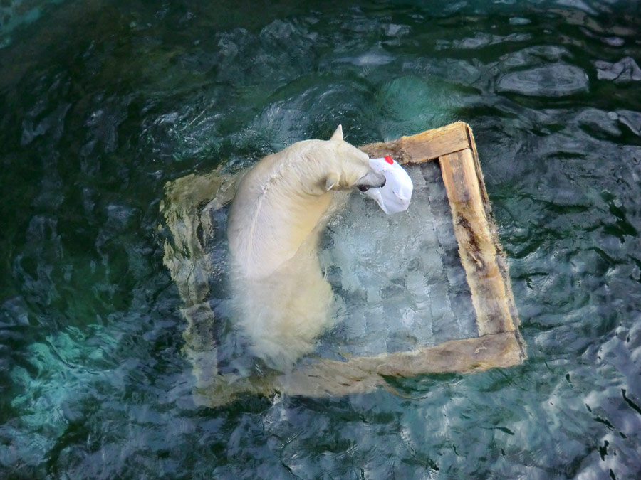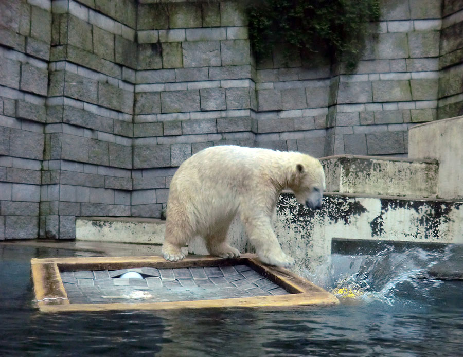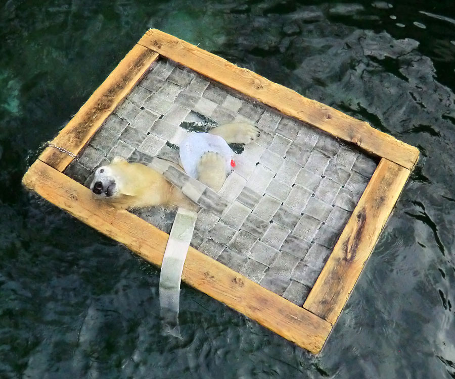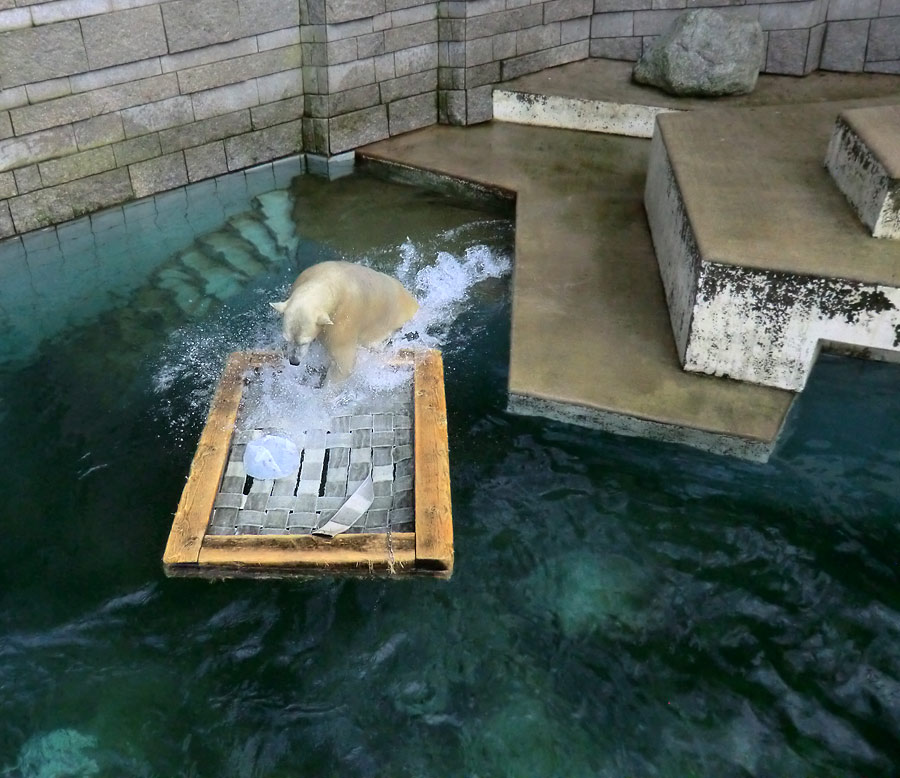 Eisbärin ANORI spielte intensiv mit ihrem Lieblingsspielzeug, dem Eisbären-Floß. Die junge Polarbärin schob allerhand Gegenstände durch die Matte des Eisbären-Floß, Mal von unten nach oben, das andere Mal umgekehrt. Zwischendurch: raus aus dem Wasser und Sprung auf das Floß.