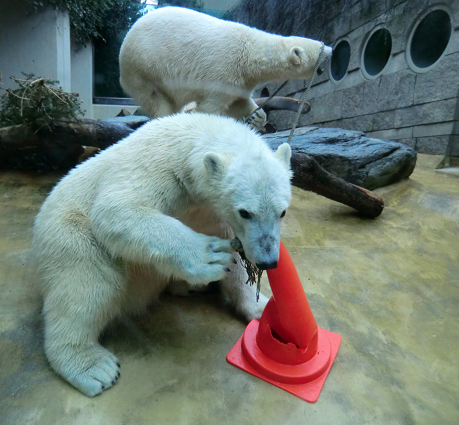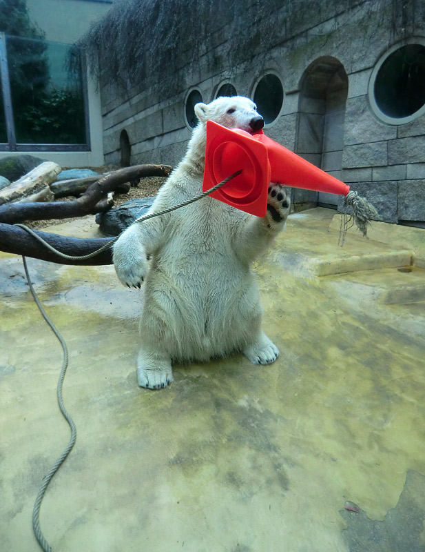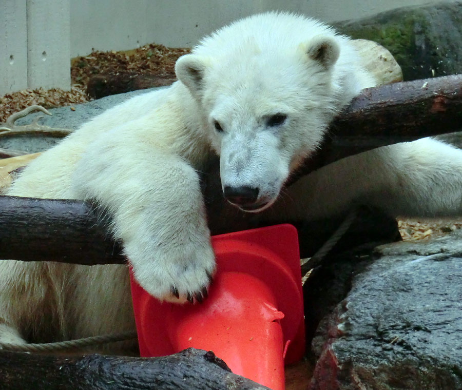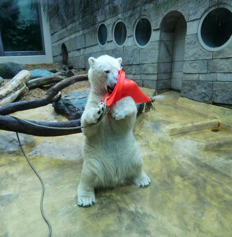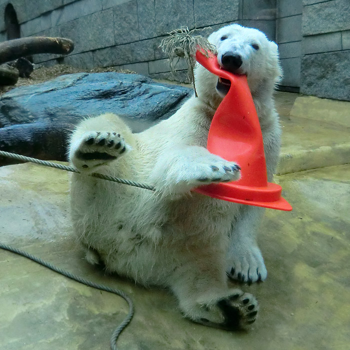 Mit einem roten Verkehrshütchen beschäftigte sich Eisbär LUKA am Sonntag Mittag, dem 16. März 2014, auf der kleinen Freianlage für Eisbären im Zoologischen Garten der Stadt Wuppertal.