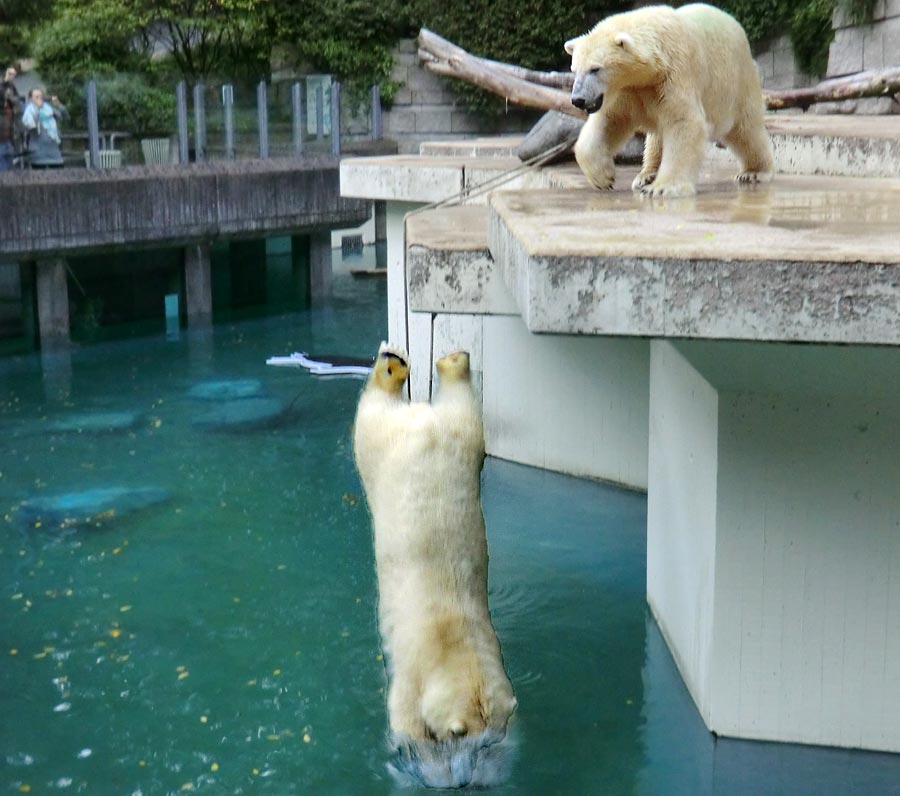 Zur Freude der Besucher/innen tobten die zwei Eisbären im Wasser, stiegen auf die Plattform, sprangen ins Wasser und suchten immer wieder die Nähe des anderen Eisbären.