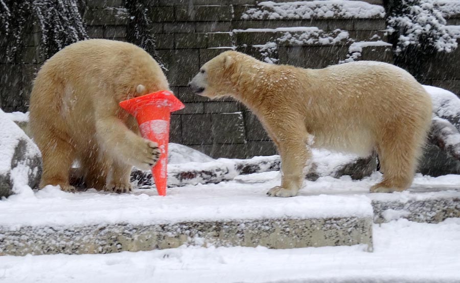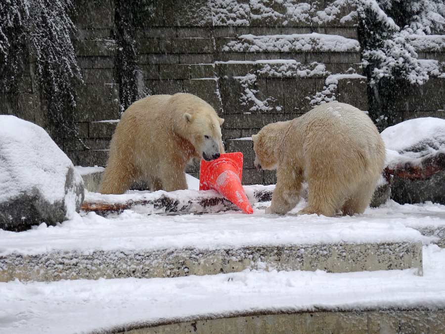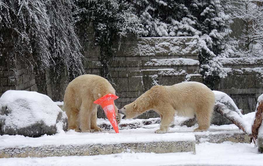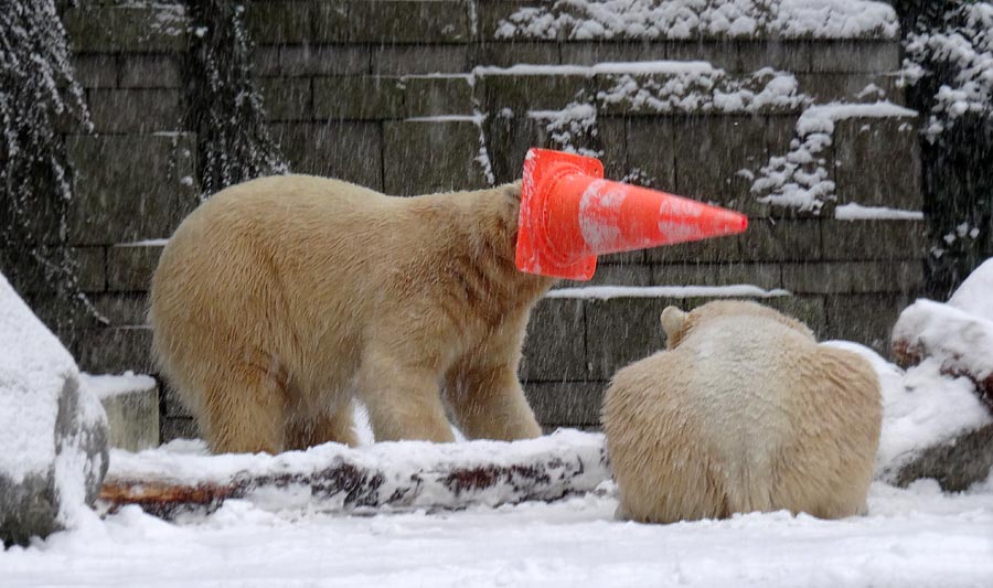 Die beiden Eisbären im Wuppertaler Zoo spielten zeitweise mit einem roten Hütchen, dass als Farbtupfer im weißen Schnee zu sehen war.