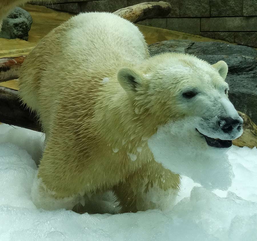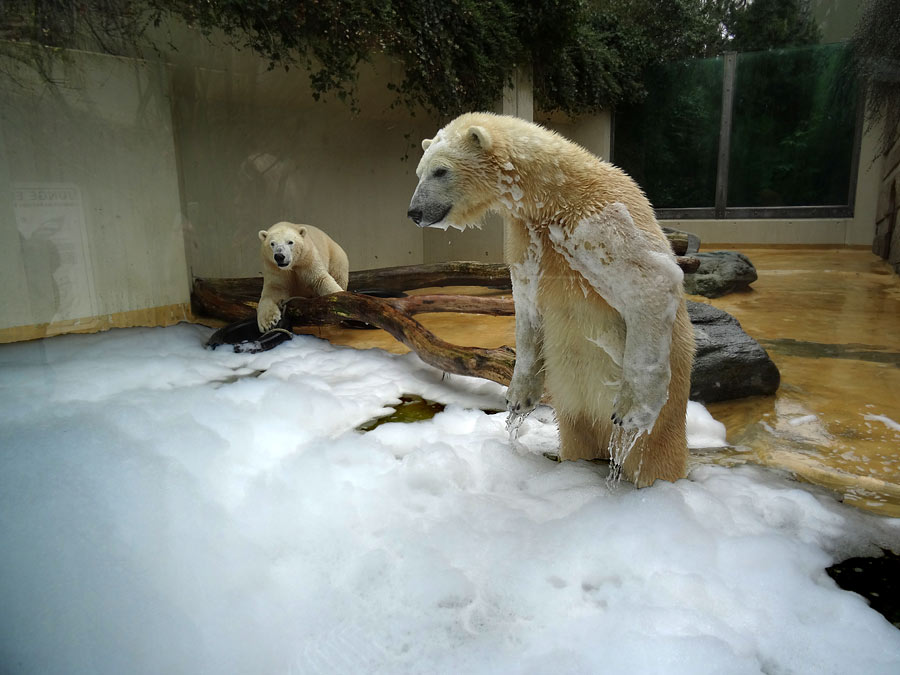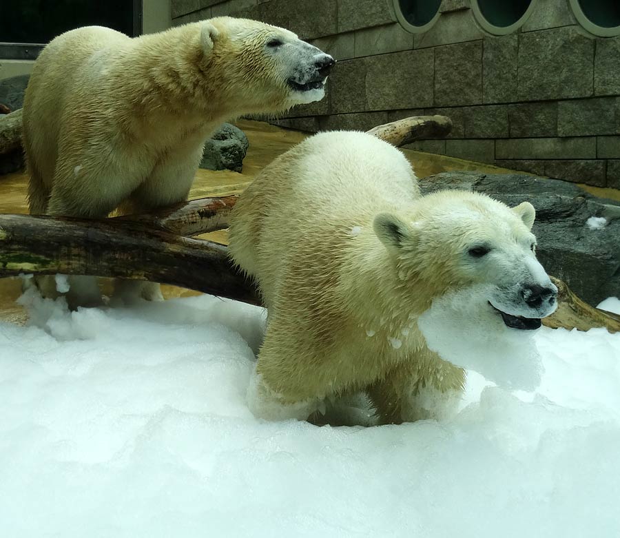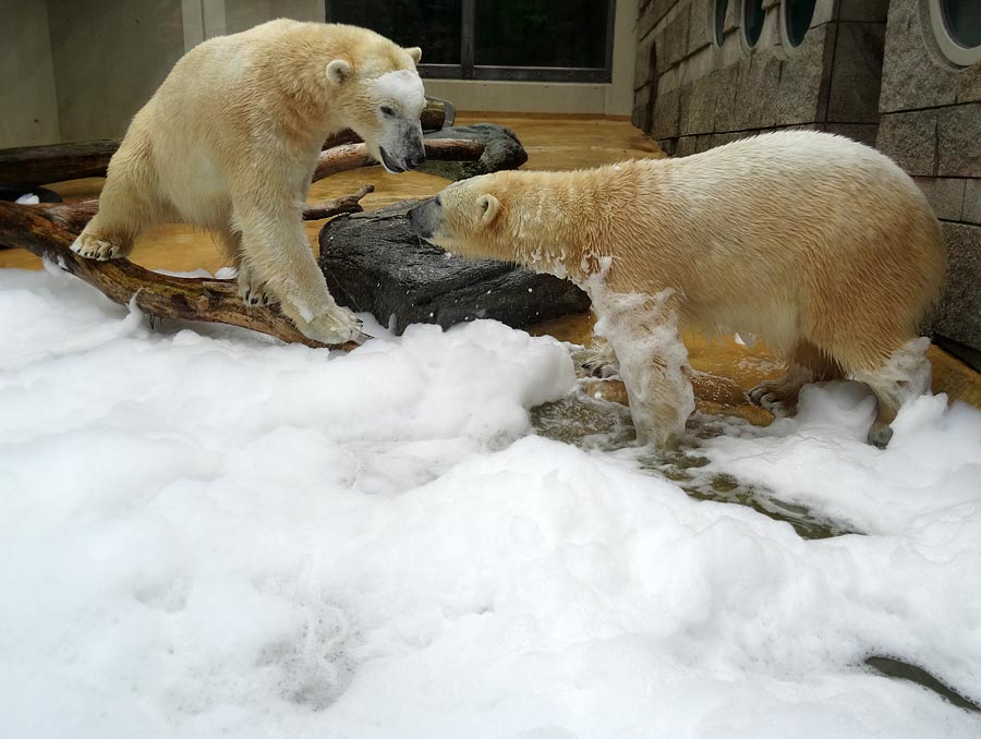 Mit der Zeit vergnügten sich die beiden Eisbären zur Freude der Besucher/innen ausgiebig mit dem Schaum, der naturgemäß nach einiger Zeit in sich zusammenfiel.
