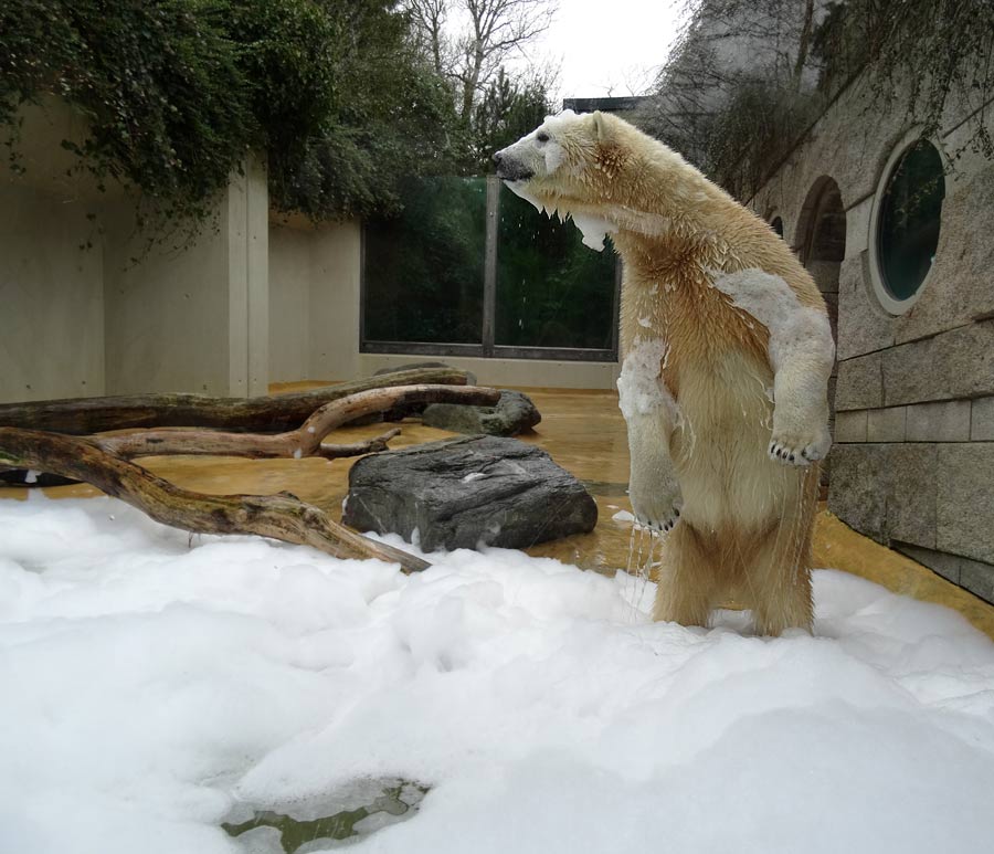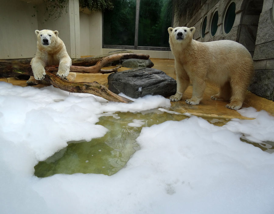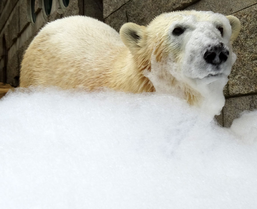 Als Beschäftigungsmaßnahme und Abwechslung für die beiden Wuppertaler Eisbären hatten die Tierpflegerinnen für eine riesige Portion Schaum auf dem Wasser gesorgt.