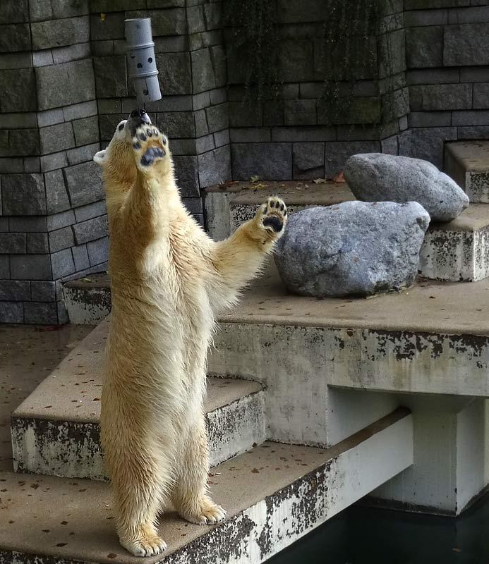Während Eisbär Luka sich dem Knabbern widmete stibitzte Eisbärin ANORI das kleine Lochrohrstück und spielte ausgiebig mit dem neuen Beschäftigungsmaterial. Dabei stellte sich die Eisbärin auch auf ihre Hinterbeine und hielt das Lochrohrstück hoch und warf es sogar in die Luft, um es wieder aufzufangen.