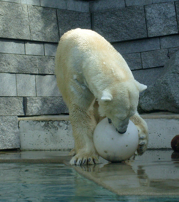 Eisbärin Jerka mit Ball im Wuppertaler Zoo am 2. April 2010.