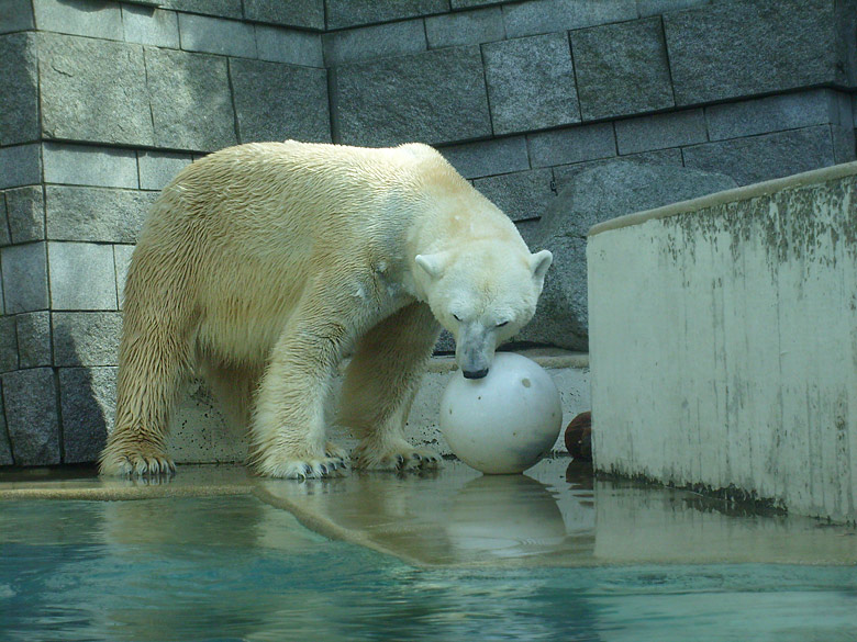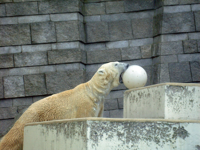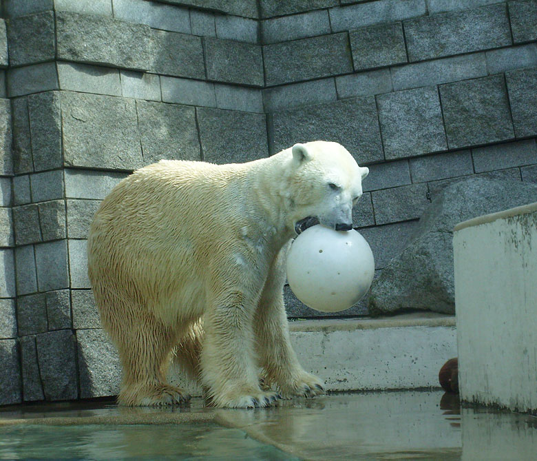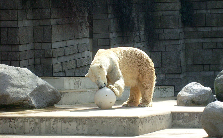 Eisbär Lars mit Ball im Wuppertaler Zoo am 2. April 2010.