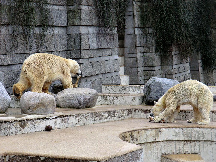 Eisbär Lars und Eisbärin Vilma am 5. März 2011 im Zoologischen Garten Wuppertal mit Knochen.