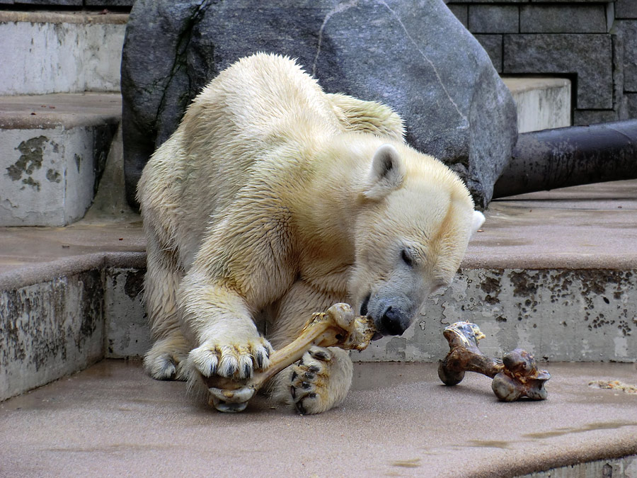 Eisbärin Vilma mit Knochen am 5. März 2011 im Zoo Wuppertal.