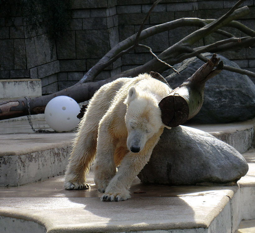 Eisbär Lars neben Ball am 5. März 2011 im Zoo Wuppertal.