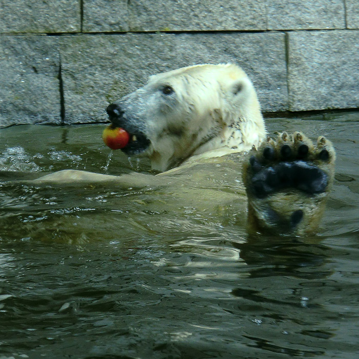 Eisbärin Vilma mit Apfel am 26. März 2011 im Zoologischen Garten Wuppertal.