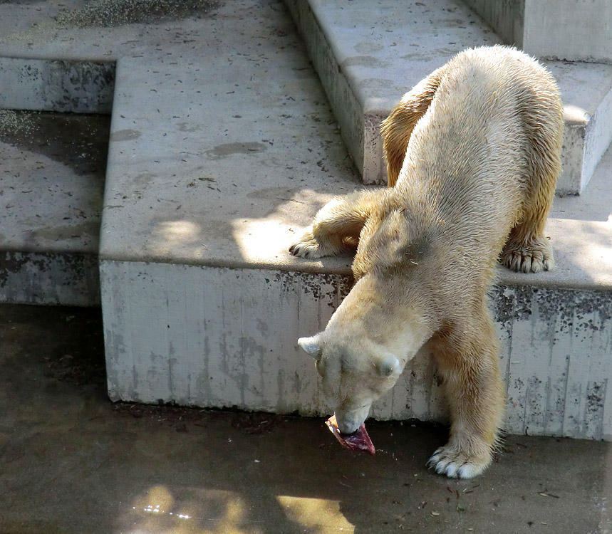 Nach der Fütterung der Seelöwen erhielt Eisbär Lars am 1. Mai 2011 im Wuppertaler Zoo einen Fleischknochen.