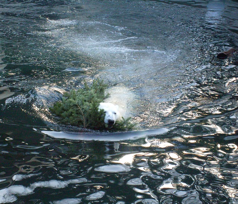 Eisbär Lars mit Tannenbaum im Wasser im Zoo Wuppertal am 26. Dezember 2009.