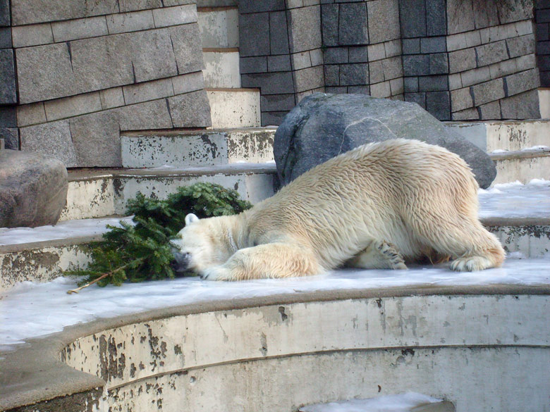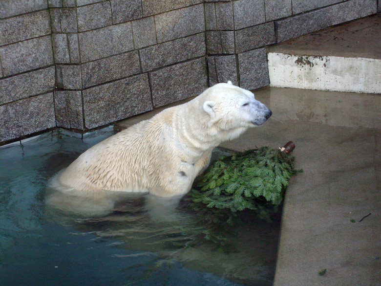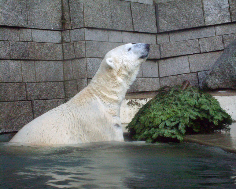 Eisbärin Jerka mit Tannenbaum im Zoo Wuppertal am 26. Dezember 2009.