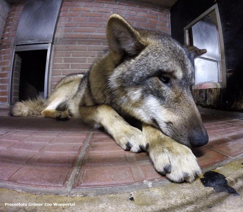 Europäischer Wolfsrüde im März 2017 im Grünen Zoo Wuppertal.