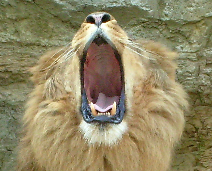 Der Löwe (Panthera leo) zeigte seine Zähne im Zoo Wuppertal im April 2008.