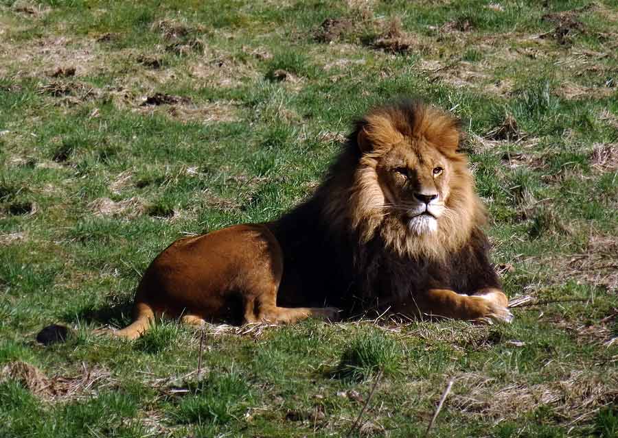 Auf der großen Freianlage für Afrikanische Löwen im Zoologischen Garten der Stadt Wuppertal dösten die drei Löwen-Männchen und zwei Löwen-Weibchen friedlich im wärmenden Licht der Spätnachmittags-Sonne.