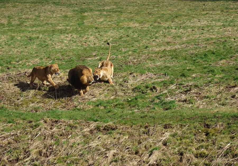 Vor dem nahenden Fütterungstermin wurde eine Löwin wohl übermütig. Zusammen mit der anderen Löwin attackierte sie, wie bereits mehrfach in den letzten Monaten, ein bestimmtes Löwen-Männchen. Der Löwenkater setzte sich zur Wehr.