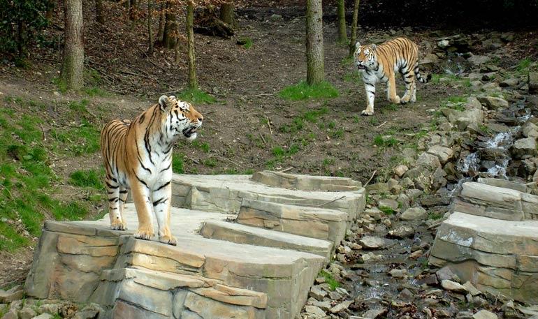 Durch das Gehege der Sibirischen Tiger "Mandschu" und "Wassja" fließt Wasser.