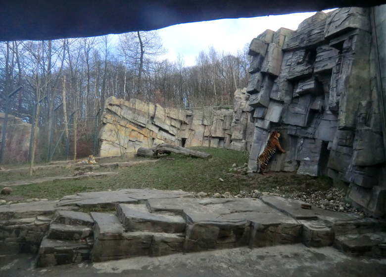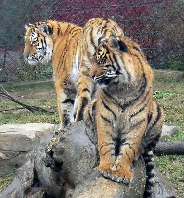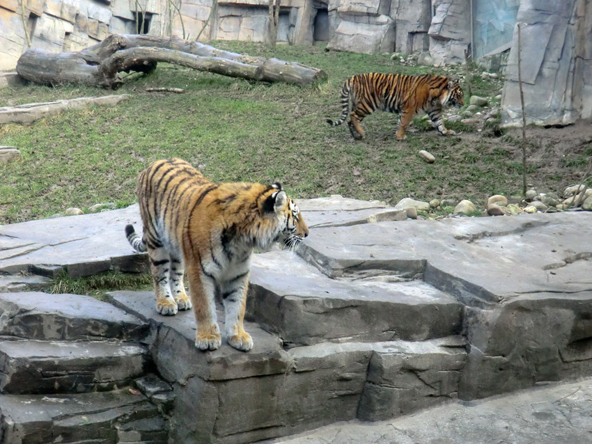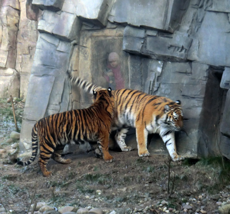 Sumatra Tigerjungtier DASEEP und Sibirisches Tigerjungtier TSCHUNA im Zoologischen Garten Wuppertal am 17. Januar 2012.