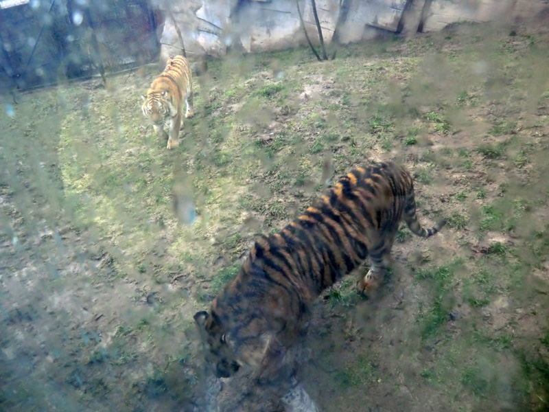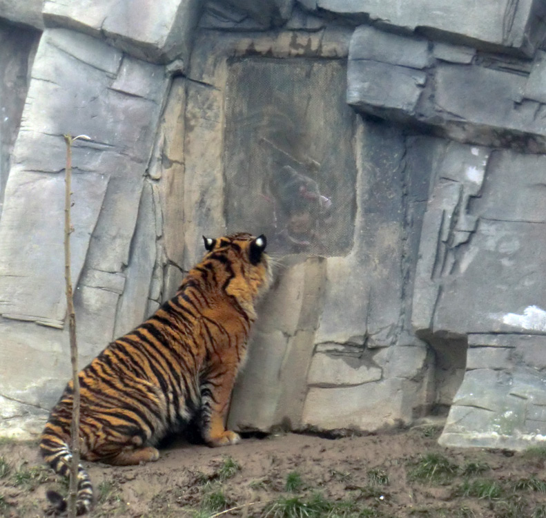 Sumatra Tigerjungtier DASEEP und Sibirisches Tigerjungtier TSCHUNA im Wuppertaler Zoo am 14. Januar 2012.