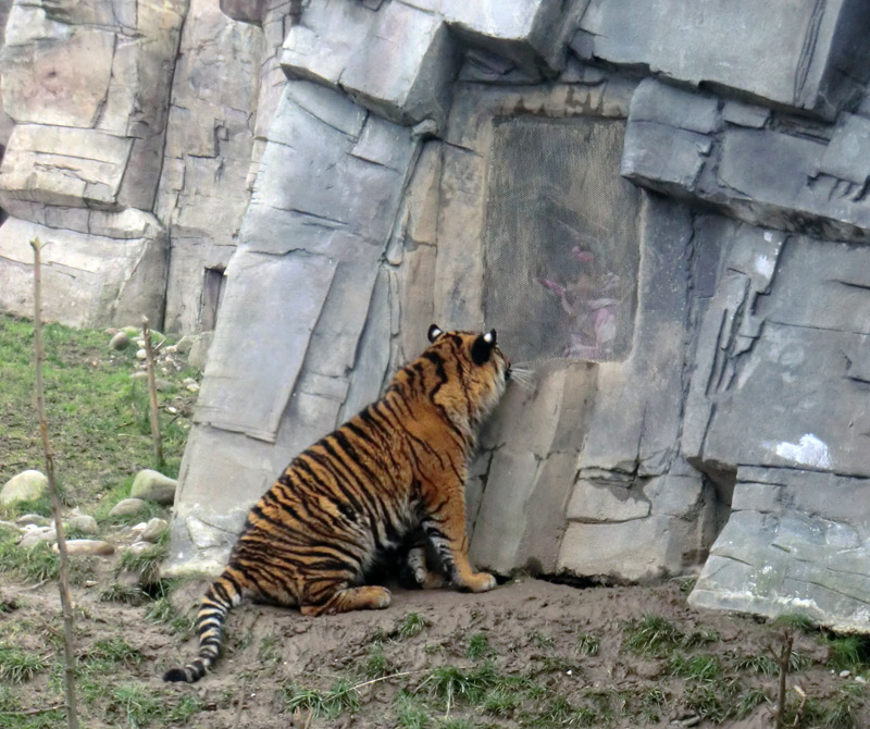 Sumatra Tigerjungtier DASEEP am Riechgitter im Zoologischen Garten Wuppertal am 14. Januar 2012.