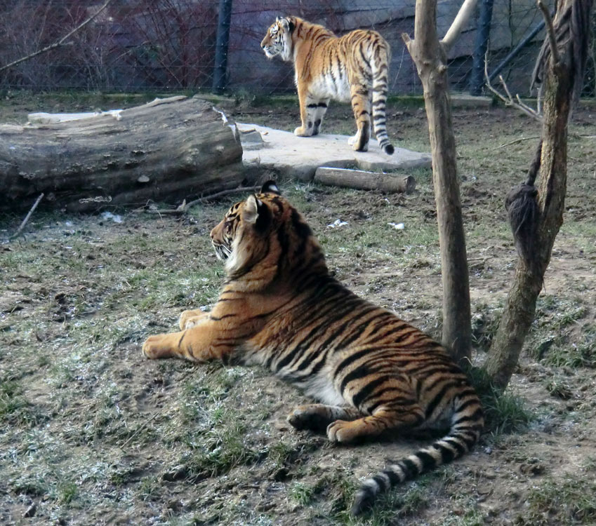 Sibirisches Tigerjungtier TSCHUNA und Sumatra Tigerjungtier DASEEP im Zoologischen Garten Wuppertal am 14. Januar 2012.