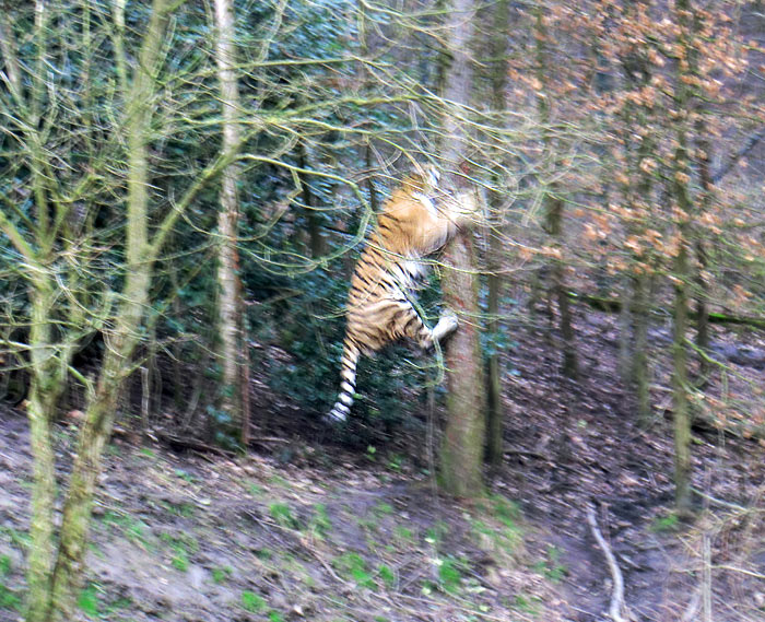 Sibirischer Tiger WASSJA klettert am Baum im Wuppertaler Zoo im März 2014. (Bild leider unscharf)