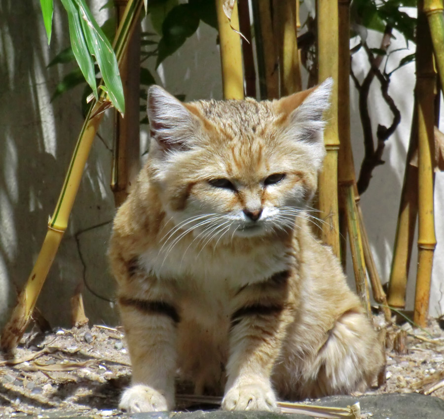Endlich Sommer! Nicht nur die Zoobesucher/innen freuten sich am 24. Juli 2012 über Sommertemperaturen von deutlich über 25 Grad. Auch die Sandkatzen im Zoologischen Garten der Stadt Wuppertal konnten die wärmenden Sonnenstrahlen in den Außengehegen des Kleinkatzenhauses stundenlang geniessen.