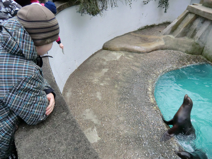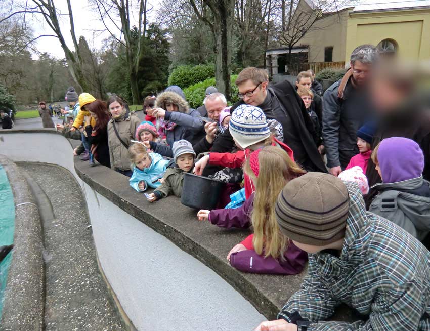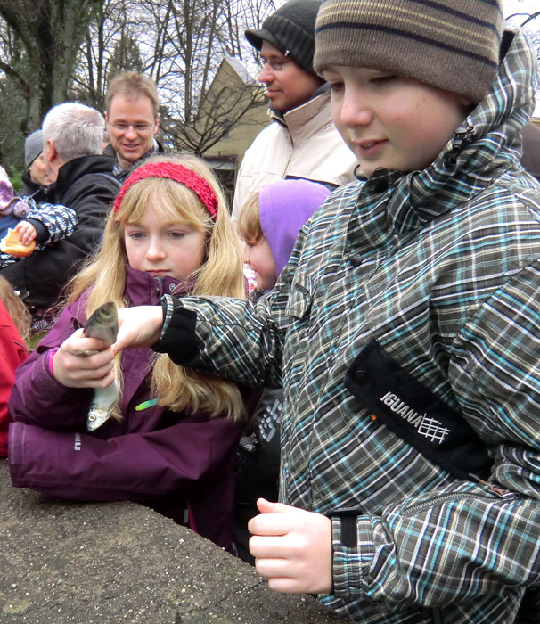 Nach der kommentierten Schaufütterung mit der Tierpflegerin gab es eine "Weihnachtsüberraschung" für die Kinder. Ein Tierpfleger brachte zwei Eimer mit Fischen, die die anwesenden Kids den Kalifornischen Seelöwen zuwerfen durften.