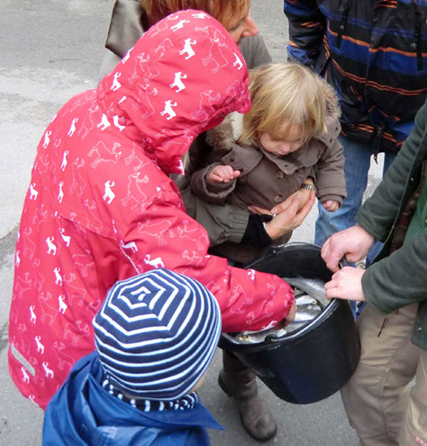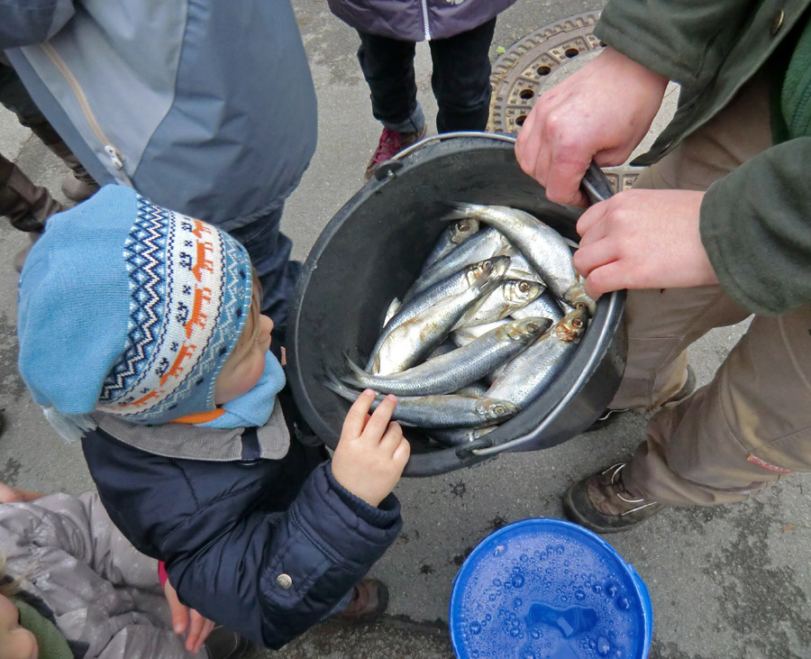 Eine Tierpflegerin kam nach der Schau-Fütterung mit zwei Eimern zu den Besucher/innen am Beckenrand. Der eine Eimer war gefüllt mit Fischen, im anderen Eimer konnten sich die Kids im sauberen Wasser die Hände waschen.