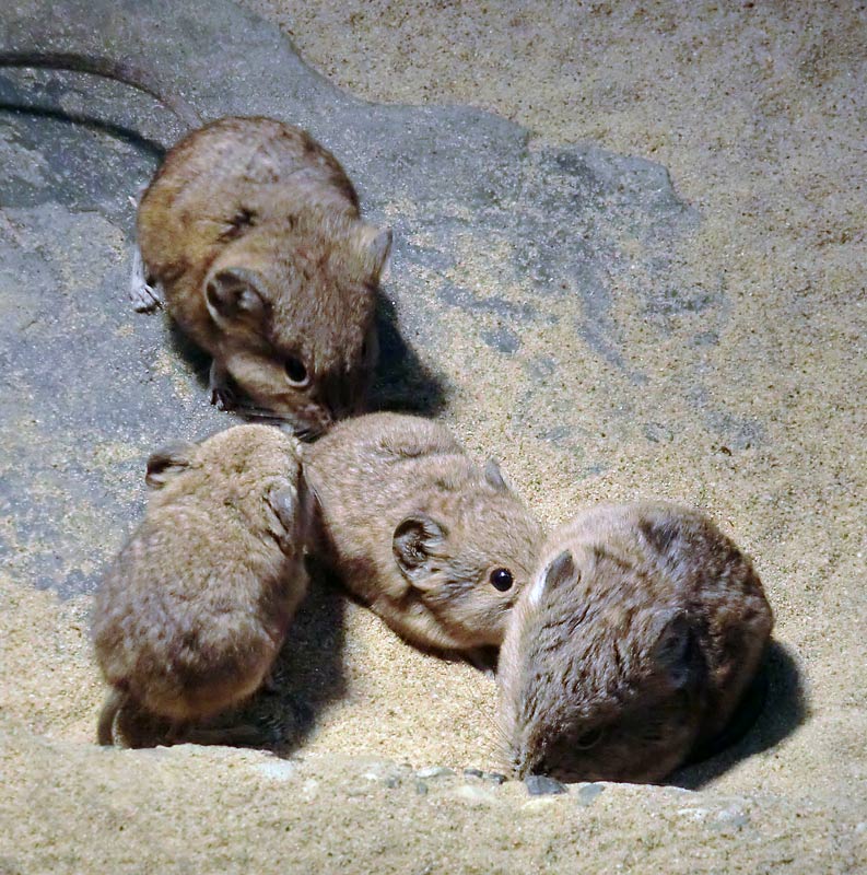 Kurzohrige Elefantenspitzmäuse mit zwei Jungtieren im Wuppertaler Zoo im Dezember 2013.