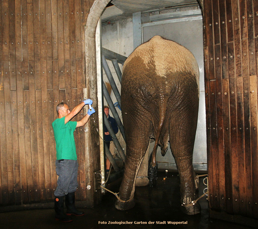 Behandlung des Afrikanischen Elefantenbullen "Tusker" im Zoologischen Garten Wuppertal im September 2012.