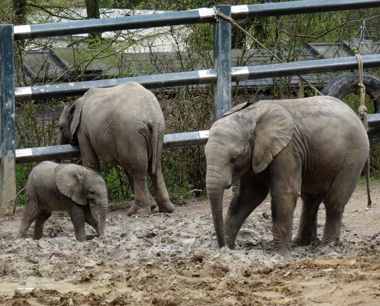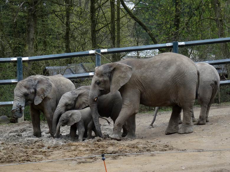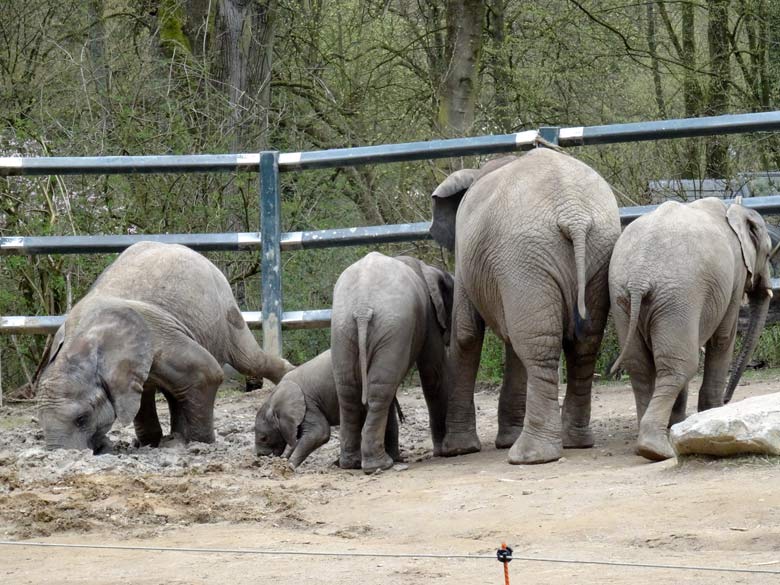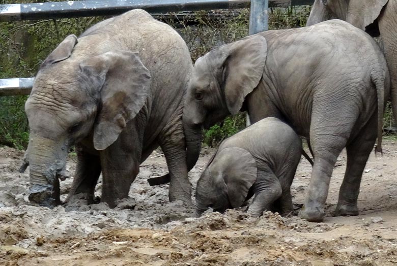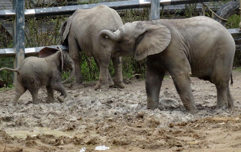Am Sonntag, dem 10. April 2016, erkundete das am 16. März 2016 geborene Elefantenkalb Tuffi im Schutz der Elefantenfamilie auf der Bullenanlage im Zoologischen Garten der Stadt Wuppertal die wunderbaren Eigenschaften von Schlamm.