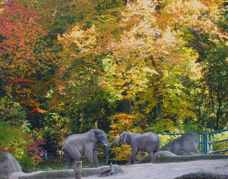 Afrikanische Elefanten vor Bäumen mit prächtigem Herbstlaub im Wuppertaler Zoo im Oktober 2008.