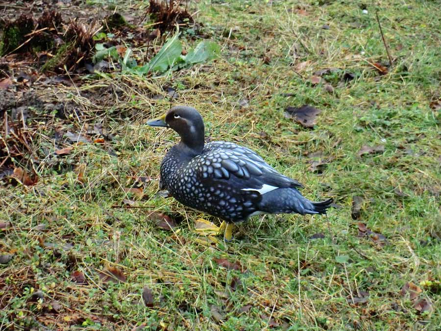 Langflügel-Dampfschiffente (Tachyeres patachonicus) im Wuppertaler Zoo im Januar 2014